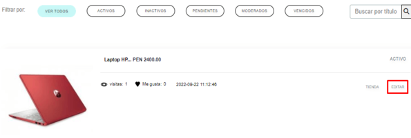 1. Al momento de Iniciar sesion, ir a perfil, seleccionar mis anuncios y darle click en el boton "editar"