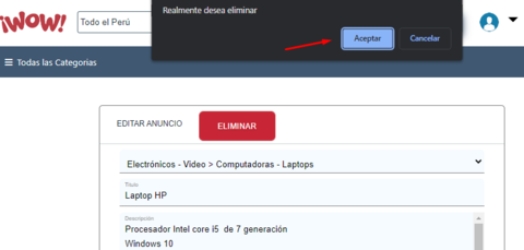 3. luego cuando hayas modificado el anuncio selecciona el boton "publicar",en el caso contrario si deseas eliminar el anuncio seleccionar en el boton "Eliminar"