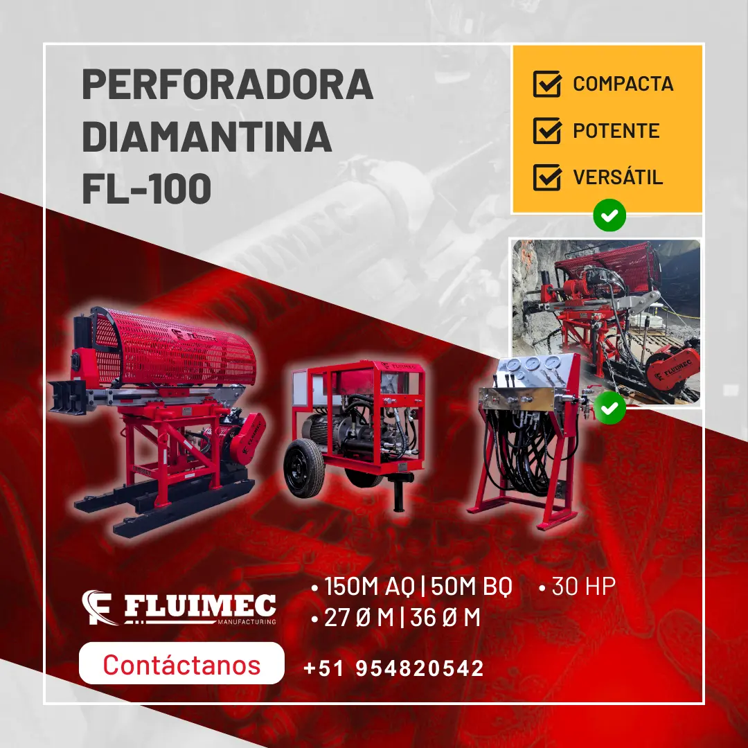 PERFORADORA PACKSACK FL-100 Explora hasta 150 m en AQ y 50 m en BQ, con testigos de 27 mm y 36 mm. Cuenta con una potencia de 30 HP y un abanico de trabajo de 180°, ideal para perforaciones y sondajes precisos. Somos Fluimec, fabricantes y distribuidores de la marca Packsack. Garantizamos el stock permanente de accesorios y repuestos originales. ¡SOLICITA TU COTIZACIÓN AHORA! 51 954 820 542 cotizaciones@fluimec.com www.fluimec.com www.packsack.com.pe Capacitación en mina gratuita - Garantía 1 año