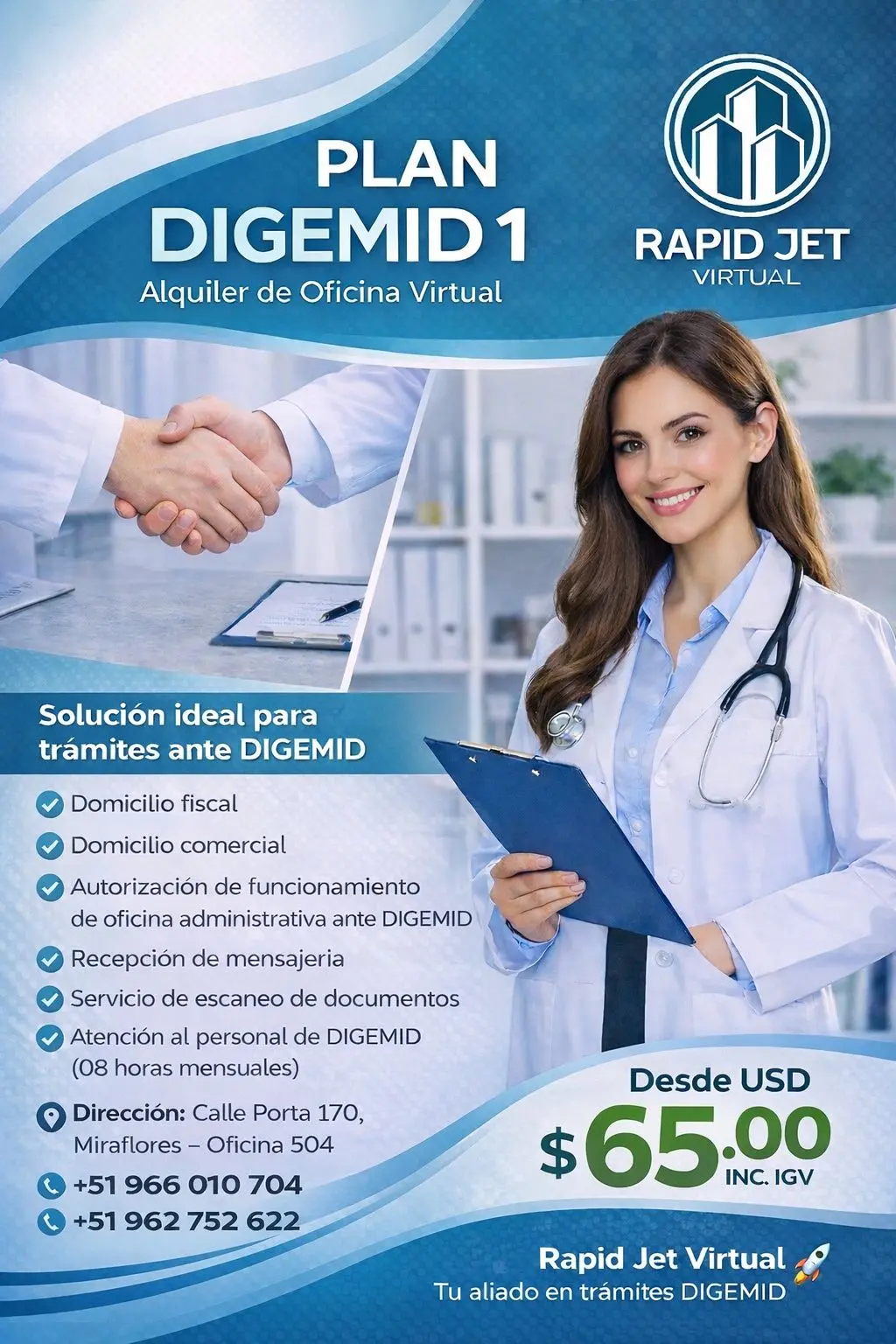La solución ideal para trámites ante DIGEMID. Diseñado para empresas del sector salud que requieren una oficina administrativa autorizada, sin asumir los costos de una oficina física. Domicilio fiscal y comercial Autorización ante DIGEMID Atención al personal DIGEMID (8 h mensuales) Mensajería y escaneo de documentos Desde USD 65 IGV incluido Miraflores Rapid Jet Virtual, tu aliado en trámites DIGEMID.