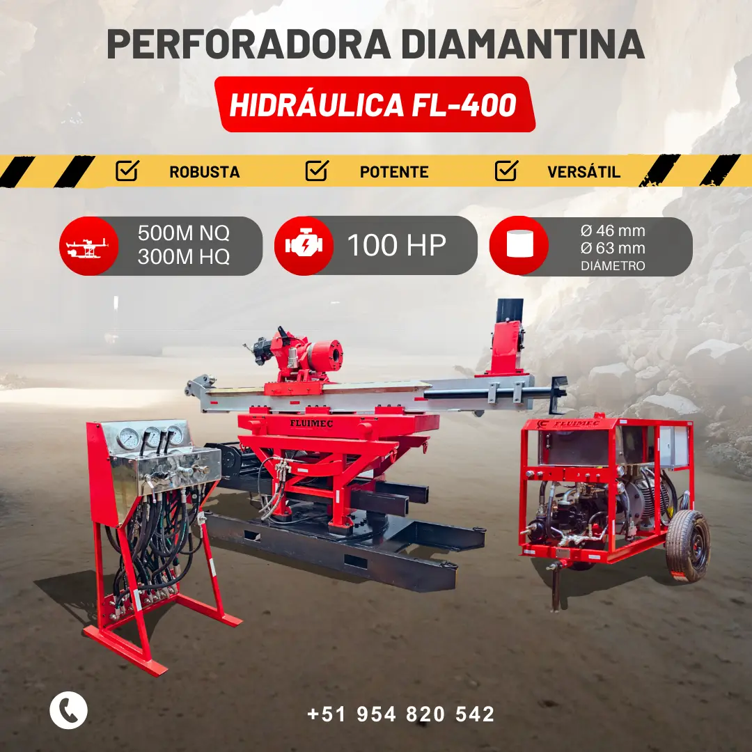 PERFORADORA PACKSACK FL- 400 Equipo con alcance de perforación de 300 m en HQ y 500 m en NQ. Trabaja con cabezal pasante y sistema Winche Wire-Line, facilitando la recuperación de núcleos. CARACTERÍSTICAS: Alcance: HQ 300 m / NQ 500 m Testigo: Ø 63 mm / Ø 47 mm Motor: Eléctrico / Diésel 100 HP Cabezal: Pasante HQ Ángulo: Positivo / Negativo (90°) Sistema: Winche Wire-Line Cámara: 6.5 m x 6.5 m x 6.5 m ¡SOLICITA TU COTIZACIÓN AHORA! (511) 361 6908 / 954 820 542 cotizaciones@fluimec.com www.fluimec.com www.packsack.com.pe Videos: https://www.youtube.com/shorts/ePG31Ku_aTM https://youtu.be/7yjMhQi_AtY