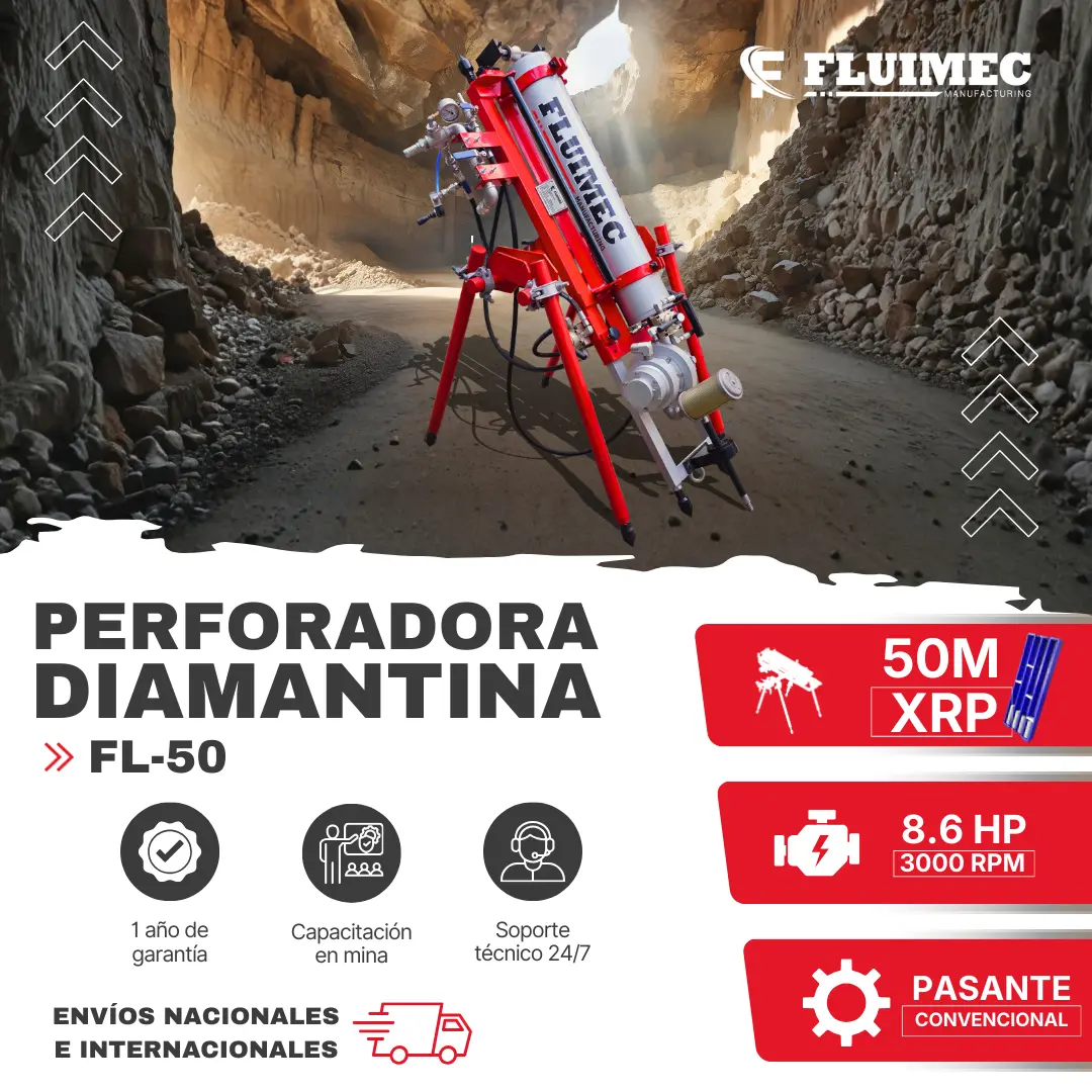 PACKSACK NEUMÁTICA FL-50 Es una máquina de perforación diamantina con un alcance de 50 metros, diámetro de muestra de 23 mm y una potencia de 8.6 HP. Ideal para exploraciones en subsuelo, estudios geológicos y muestreo de terreno. Garantizamos el stock permanente de accesorios y repuestos originales para nuestros equipos diamantina. CARACTERÍSTICAS: Alcance: XRP - 50 m Testigo: Ø 23 mm Motor: Neumático 8.6 HP (3000 RPM) Cabezal: Convencional Ángulo: Positivo / Negativo (90°) Cámara: 2.2 m x 2.2 m x 2.2 m Somos fabricantes y comercializadores de accesorios y repuestos originales de equipos diamantina. ¡SOLICITA TU COTIZACIÓN AHORA! (511) 361 6908 / 954 820 542 cotizaciones@fluimec.com