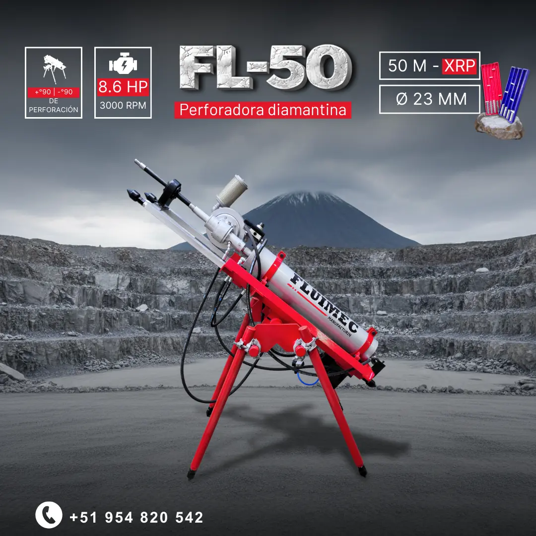 PACKSACK NEUMÁTICA FL-50 Es una máquina de perforación diamantina con un alcance de 50 metros, diámetro de muestra de 23 mm y una potencia de 8.6 HP. Ideal para exploraciones en subsuelo, estudios geológicos y muestreo de terreno. Garantizamos el stock permanente de accesorios y repuestos originales para nuestros equipos diamantina. CARACTERÍSTICAS: Alcance: XRP - 50 m Testigo: Ø 23 mm Motor: Neumático 8.6 HP (3000 RPM) Cabezal: Convencional Ángulo: Positivo / Negativo (90°) Cámara: 2.2 m x 2.2 m x 2.2 m Somos fabricantes y comercializadores de accesorios y repuestos originales de equipos diamantina. ¡SOLICITA TU COTIZACIÓN AHORA! (511) 361 6908 / 954 820 542 cotizaciones@fluimec.com www.fluimec.com www.packsack.com.pe